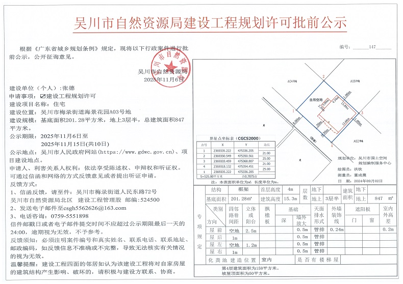 吴川市自然资源局建设工程规划许可批前公示(张德A03号地)