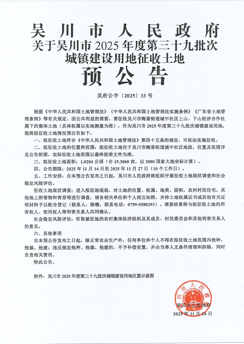 吴川市2025年第三十九批次建设用地位置图和征地预公告