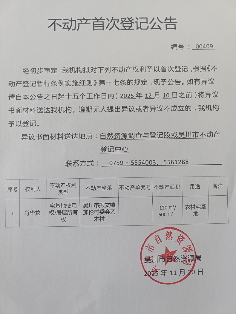 不动产首次登记公告(肖华龙)宗地面积:120.00平方米、建筑面积:600.00平方米