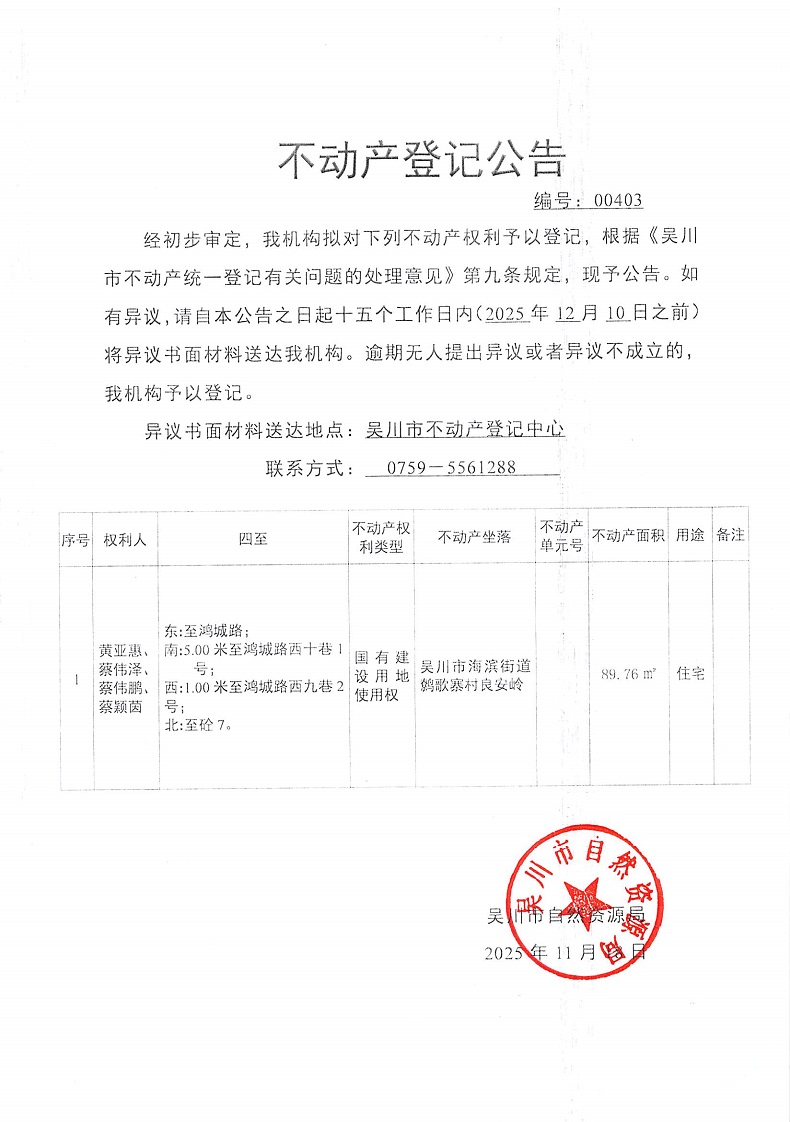 不动产登记公告(黄亚惠、蔡伟泽、蔡伟鹏、蔡颖茵)