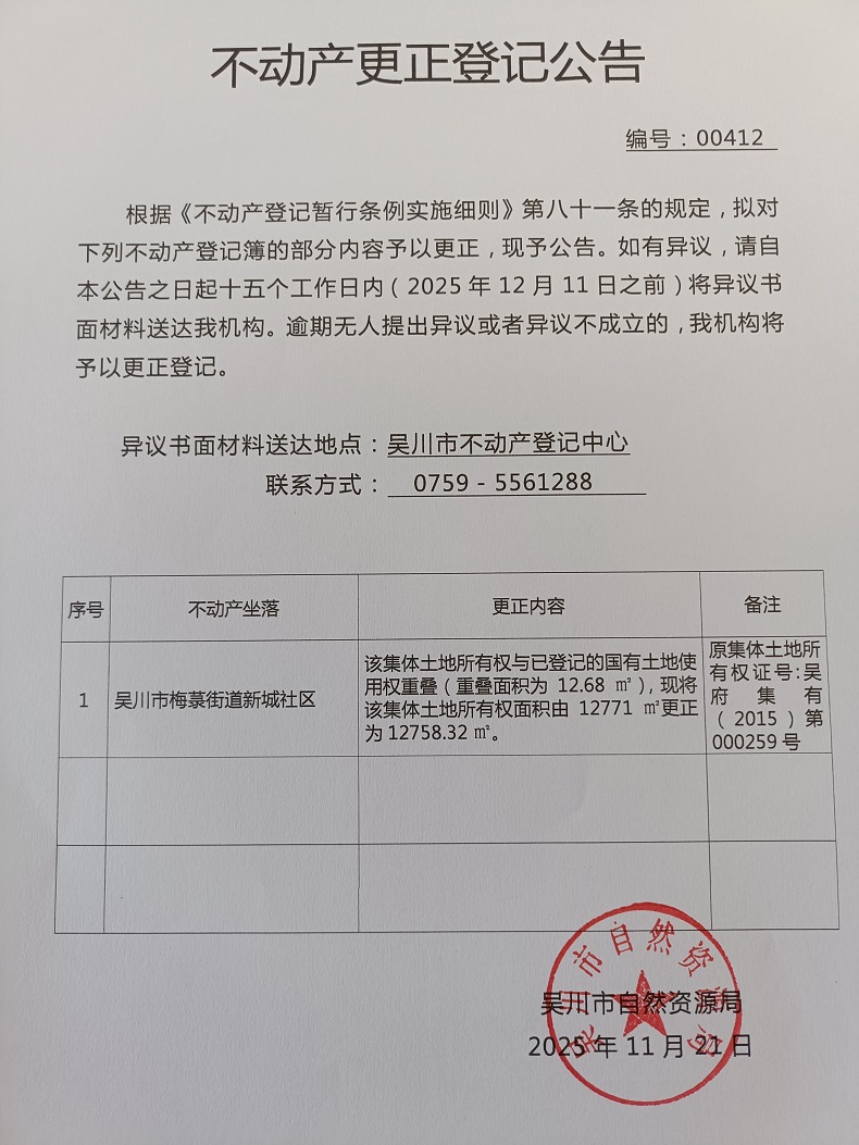 不动产更正登记公告(广东省吴川市梅菉街道新城社区黄竹尾经济合作社)宗地面积:12758.32平方米