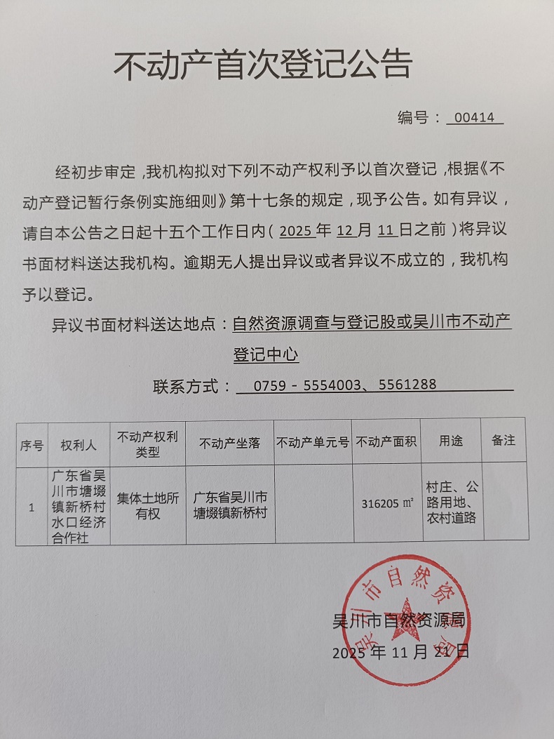 不动产首次登记公告(广东省吴川市塘㙍镇新桥村水口经济合作社)宗地面积:316205平方米