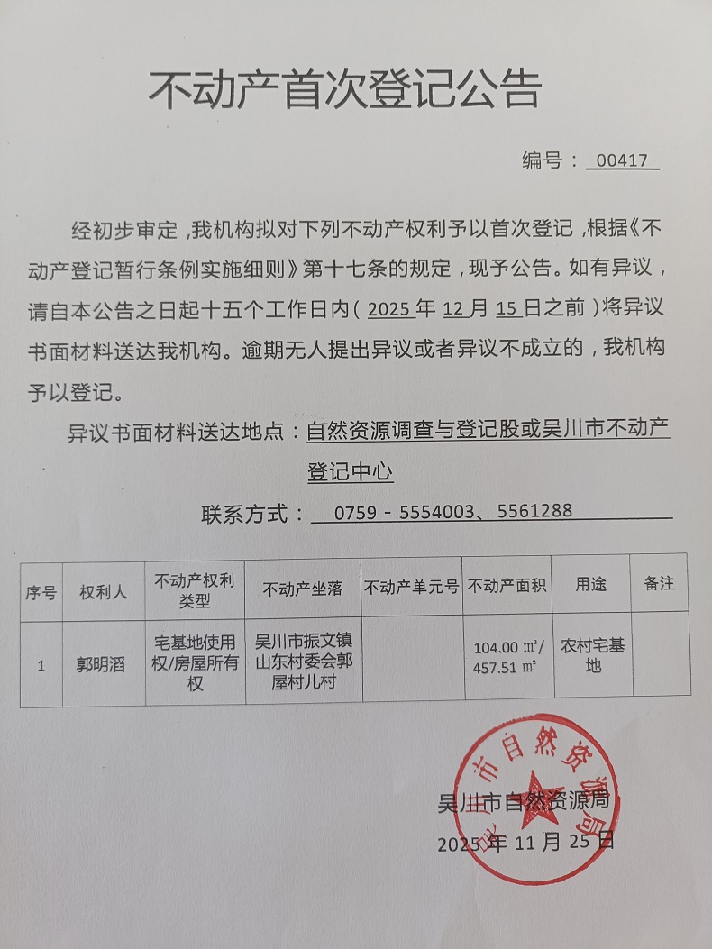 不动产首次登记公告(郭明滔)宗地面积:104.00平方米、建筑面积:457.51平方米