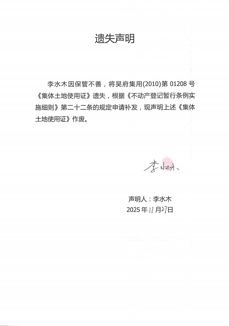 遗失声明(李水木)