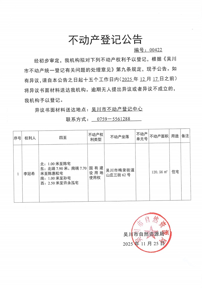 不动产登记公告(李冠希)