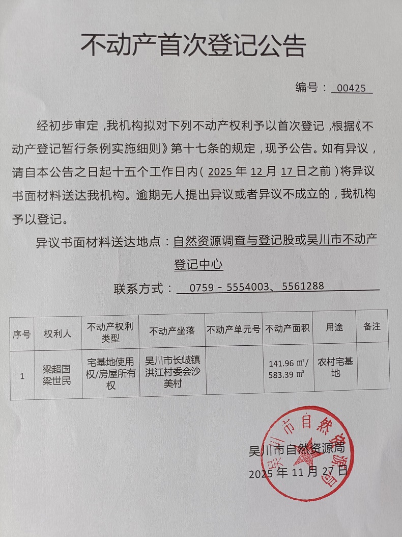 不动产首次登记公告(梁超国、梁世民)宗地面积:141.96平方米、建筑面积:583.39平方米