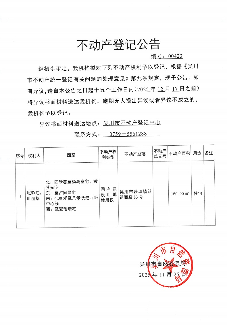 不动产登记公告(张称旺、叶丽华)