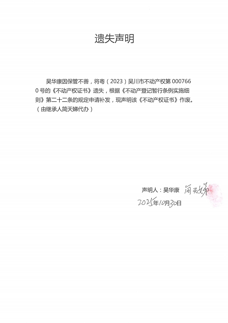 遗失声明(吴华康)