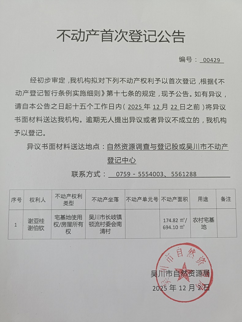 不动产首次登记公告(谢亚桂、谢伯钦)宗地面积:174.82平方米、建筑面积:694.10平方米