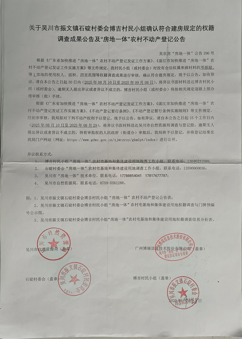 吴川市振文镇石碇村委会博吉村民小组确认符合建房规定的权籍调查成果公告及“房地一体”农村不动产登记公告