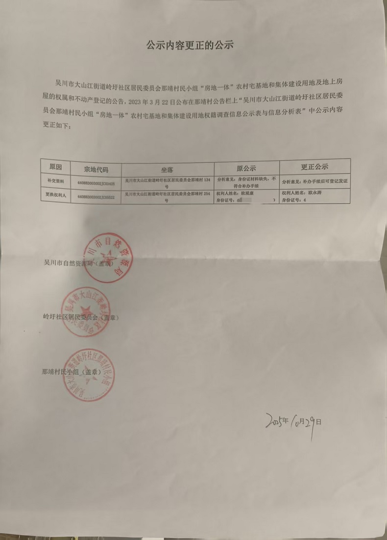吴川市大山江街道岭圩社区居民委员会那靖村公示内容更正的公示