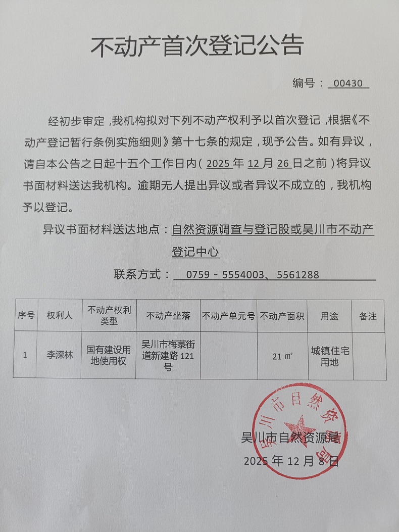 不动产首次登记公告(李深林)宗地面积:21.00平方