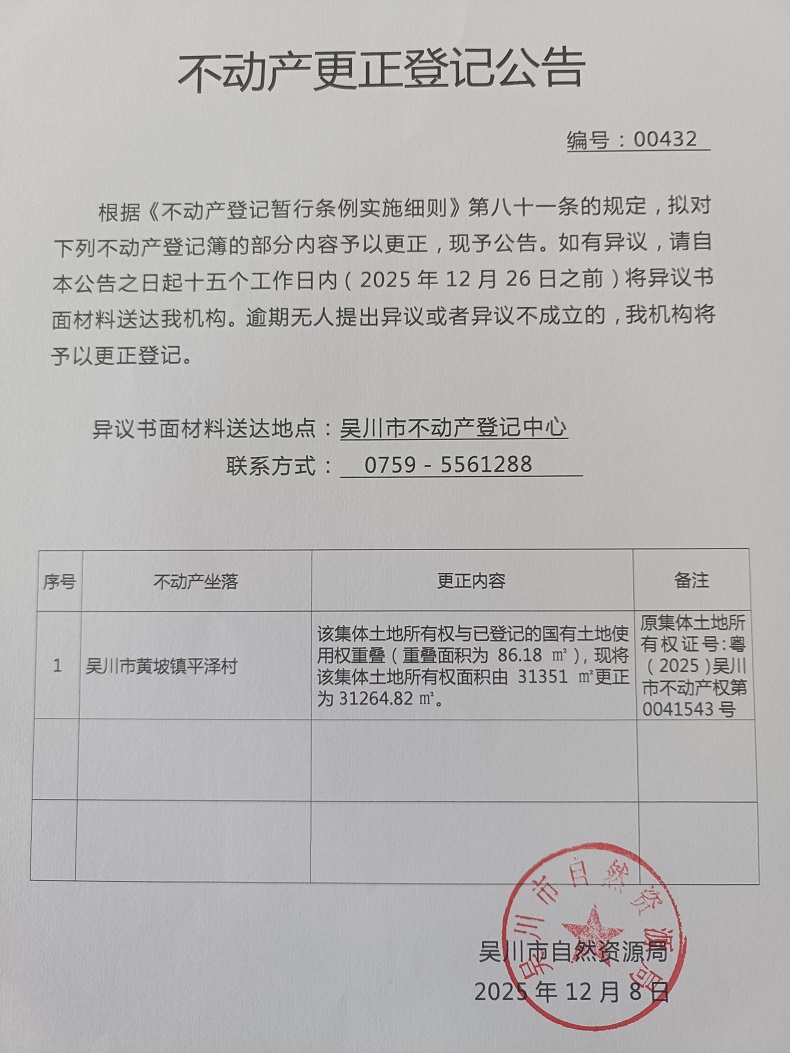 不动产更正登记公告(广东省吴川市黄坡镇平泽村蛇地经济合作社)宗地面积:31264.82平方米