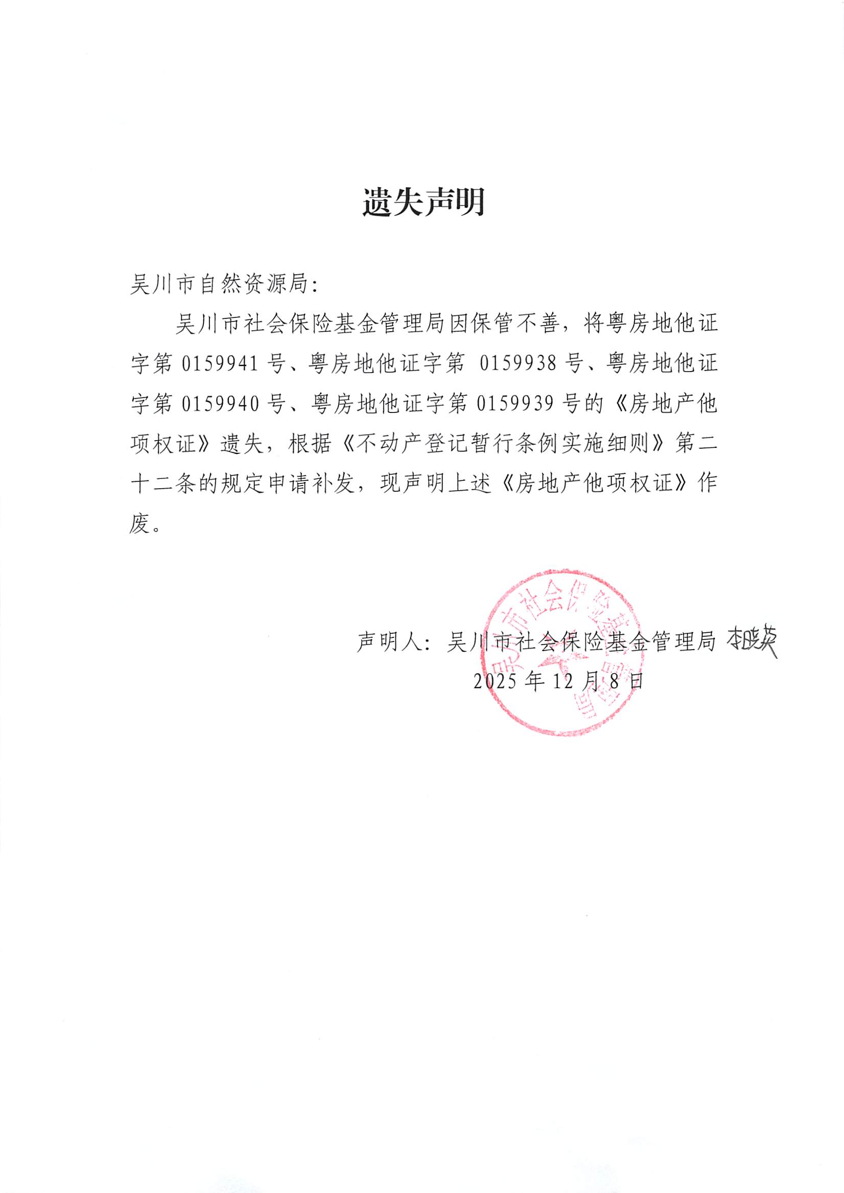 遗失声明(吴川市社会保险基金管理局)