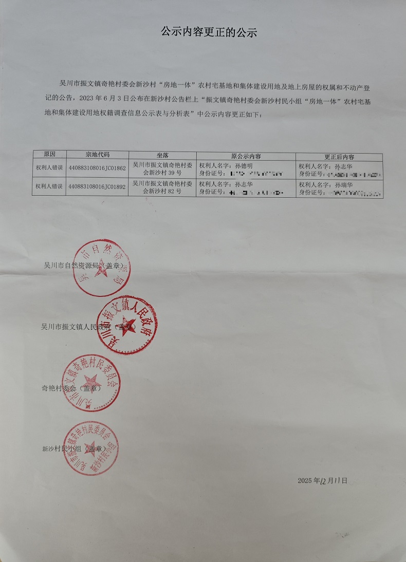 吴川市振文镇奇艳村委会新沙村公示内容更正的公