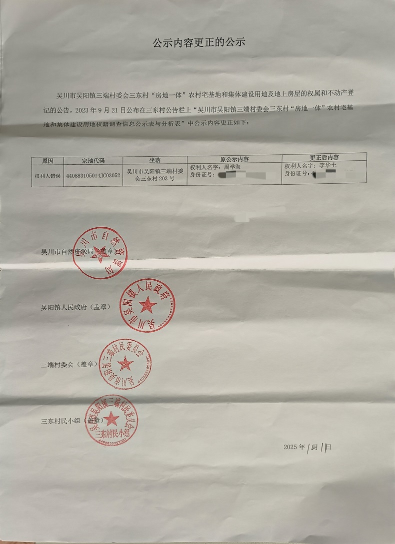 吴川市吴阳镇三端村委会三东村公示内容更正的公示