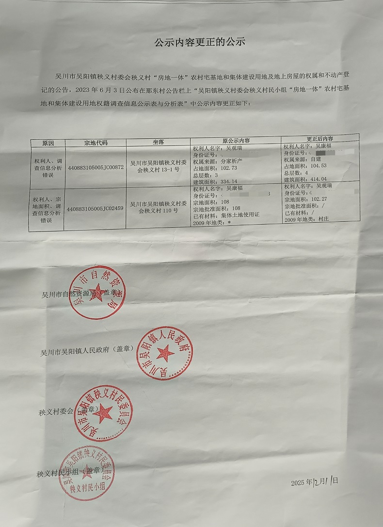 吴川市吴阳镇秧义村委会秧义村公示内容更正的公示