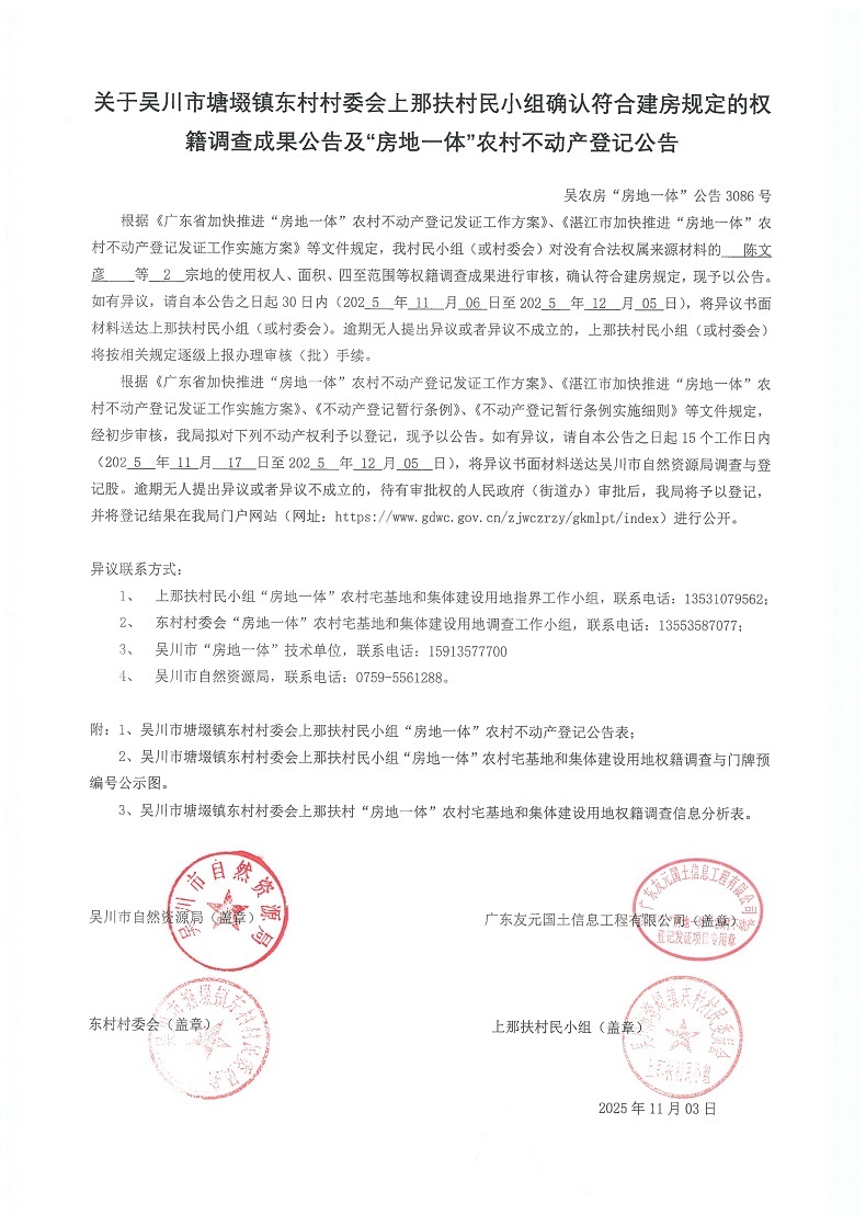 吴川市塘㙍镇东村村委会上那扶村民小组“房地一体”农村宅基地和集体建设用地及地上房屋的权属和不动产登记的公告