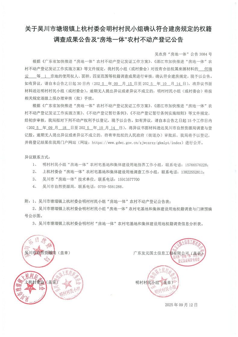 吴川市塘㙍镇上杭村委会明村村民小组“房地一体”农村宅基地和集体建设用地及地上房屋的权属和不动产登记的公告