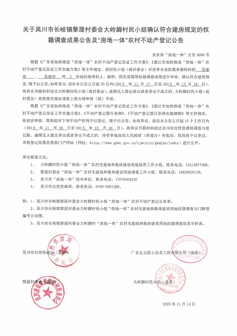 吴川市长岐镇黎屋村委会大岭脚村民小组“房地一体”农村宅基地和集体建设用地及地上房屋的权属和不动产登记的公告