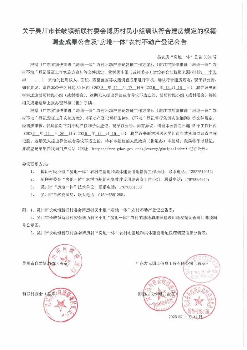 吴川市长岐镇新联村委会博历村民小组“房地一体”农村宅基地和集体建设用地及地上房屋的权属和不动产登记的公告