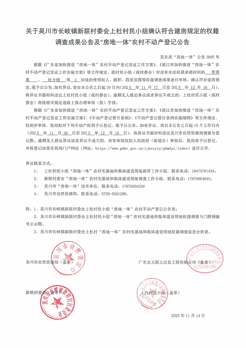 吴川市长岐镇新联村委会上杜村民小组“房地一体”农村宅基地和集体建设用地及地上房屋的权属和不动产登记的公告