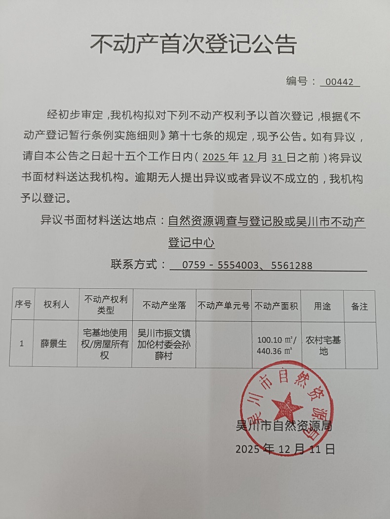 不动产首次登记公告(薛景生)宗地面积:100.10平方米、建筑面积:440.36平方米