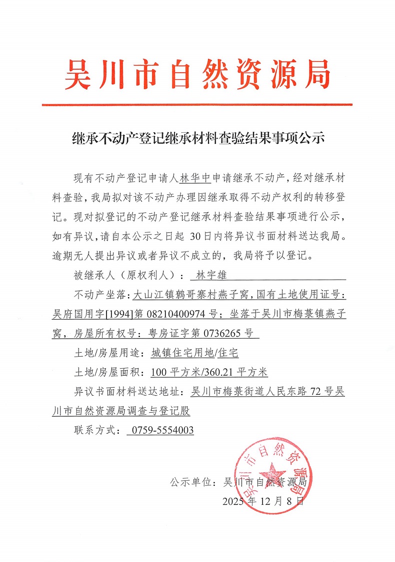 继承不动产登记继承材料查验结果事项公示(林宇雄)