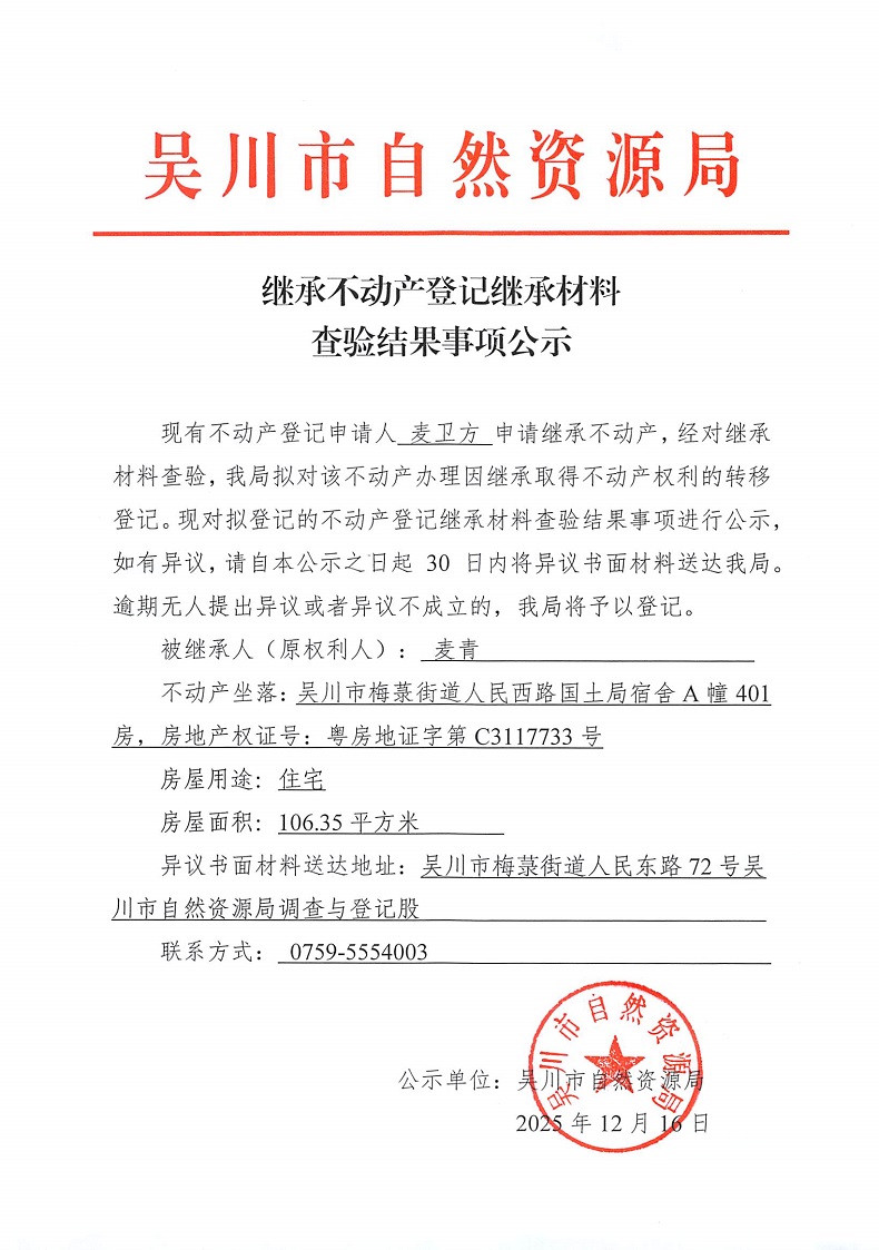 继承不动产登记继承材料查验结果事项公示(麦青——吴川市梅菉街道人民西路国土局宿舍A幢401房)