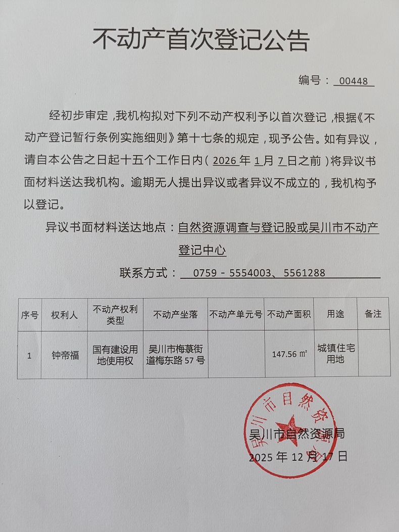 不动产首次登记公告(钟帝福)宗地面积:147.56平方米