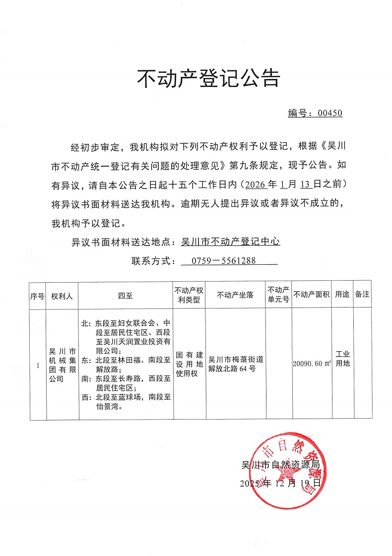 不动产登记公告(吴川市机械集团有限公司)