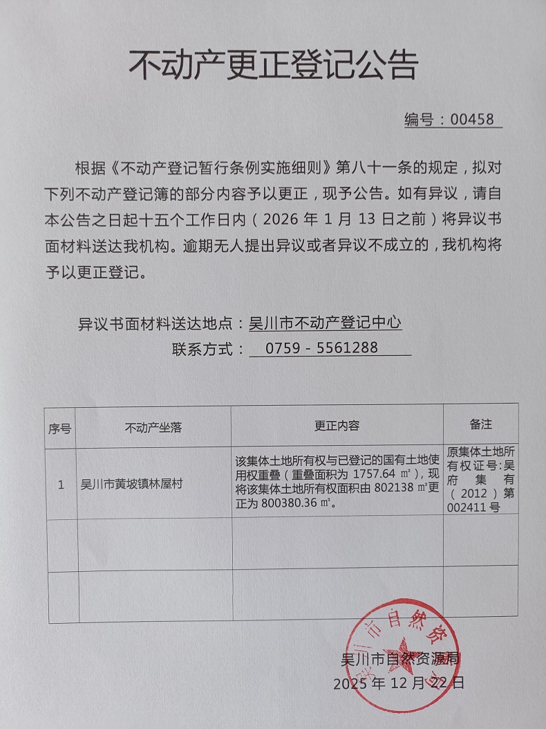 不动产更正登记公告(广东省吴川市黄坡镇林屋村山溪洋经济合作社)宗地面积:800380.36平方米