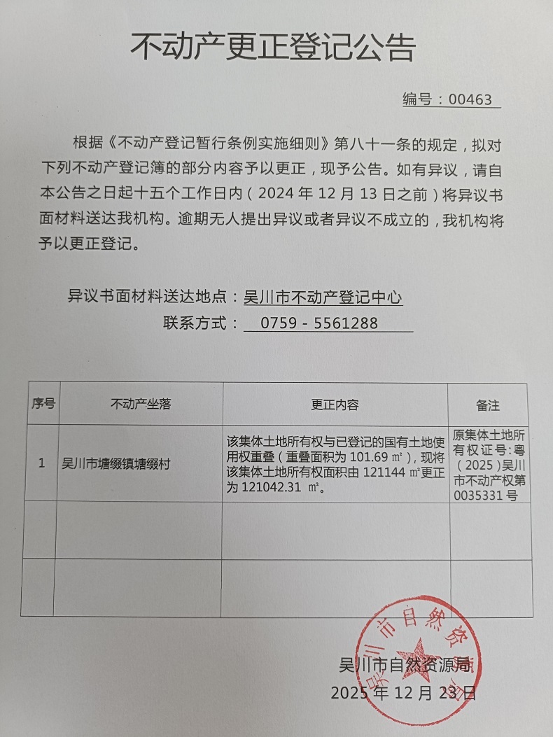 不动产更正登记公告(广东省吴川市塘㙍镇塘㙍村笋岭坡、大塘边、莲花、油麻坡、竹仔元、下圩、葵元经济合作社)宗地面积:121042.31平方米