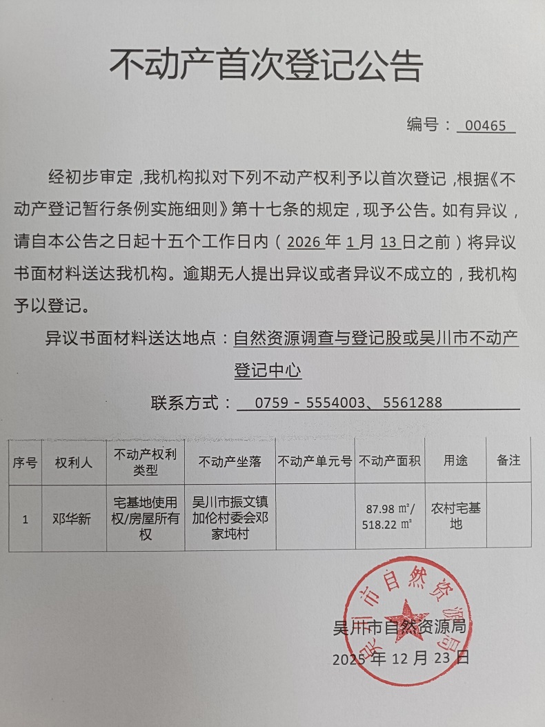 不动产首次登记公告(邓华新)宗地面积:87.98平方米、建筑面积:518.22平方米