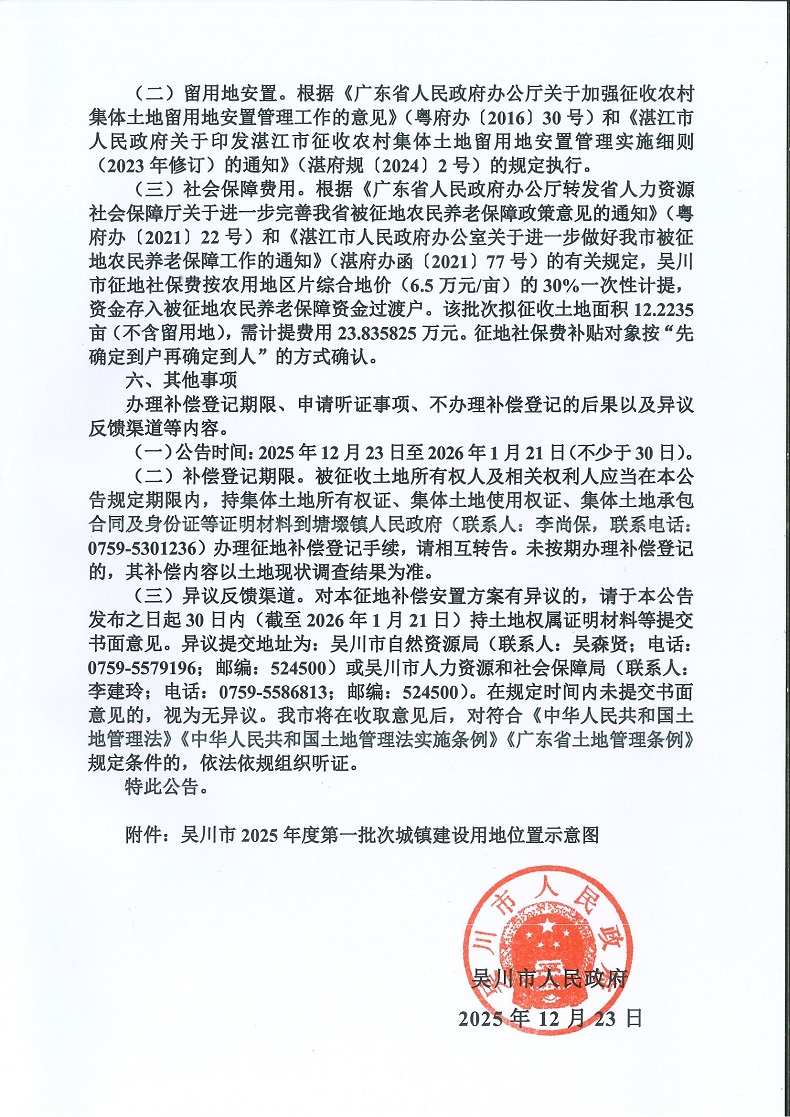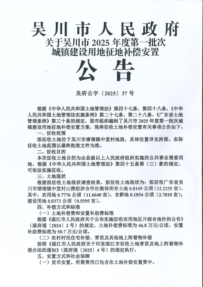 月神直播 关于吴川市2025年度第一批次城镇建设用地征地补偿安置公告