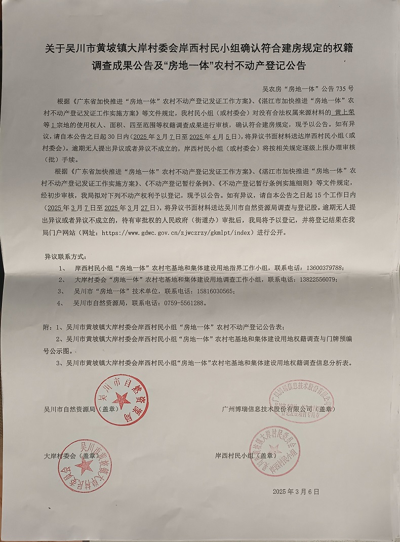 吴川市黄坡镇大岸村委会岸西村民小组确认符合建房规定的权籍调查成果公告及“房地一体”农村不动产登记公告