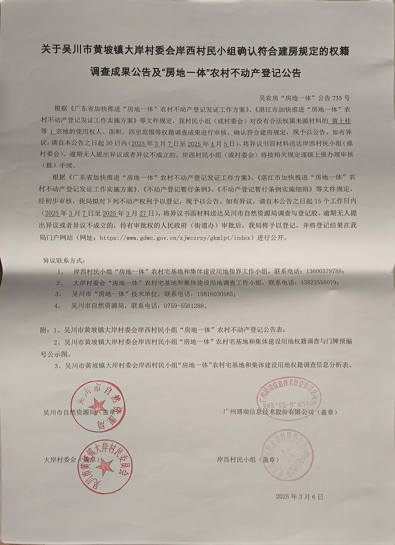 吴川市黄坡镇大岸村委会岸西村民小组确认符合建房规定的权籍调查成果公告及“房地一体”农村不动产登记公告
