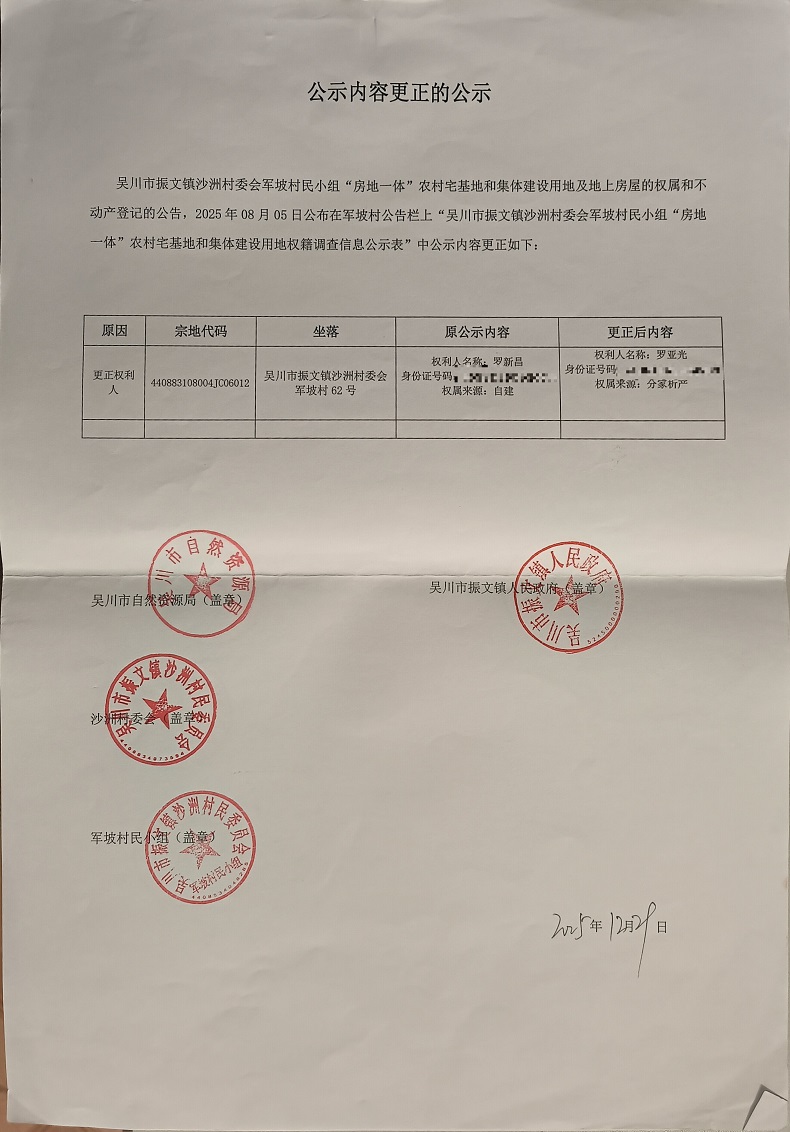 吴川市振文镇沙洲村委会军坡村民小组公示内容更正的公告
