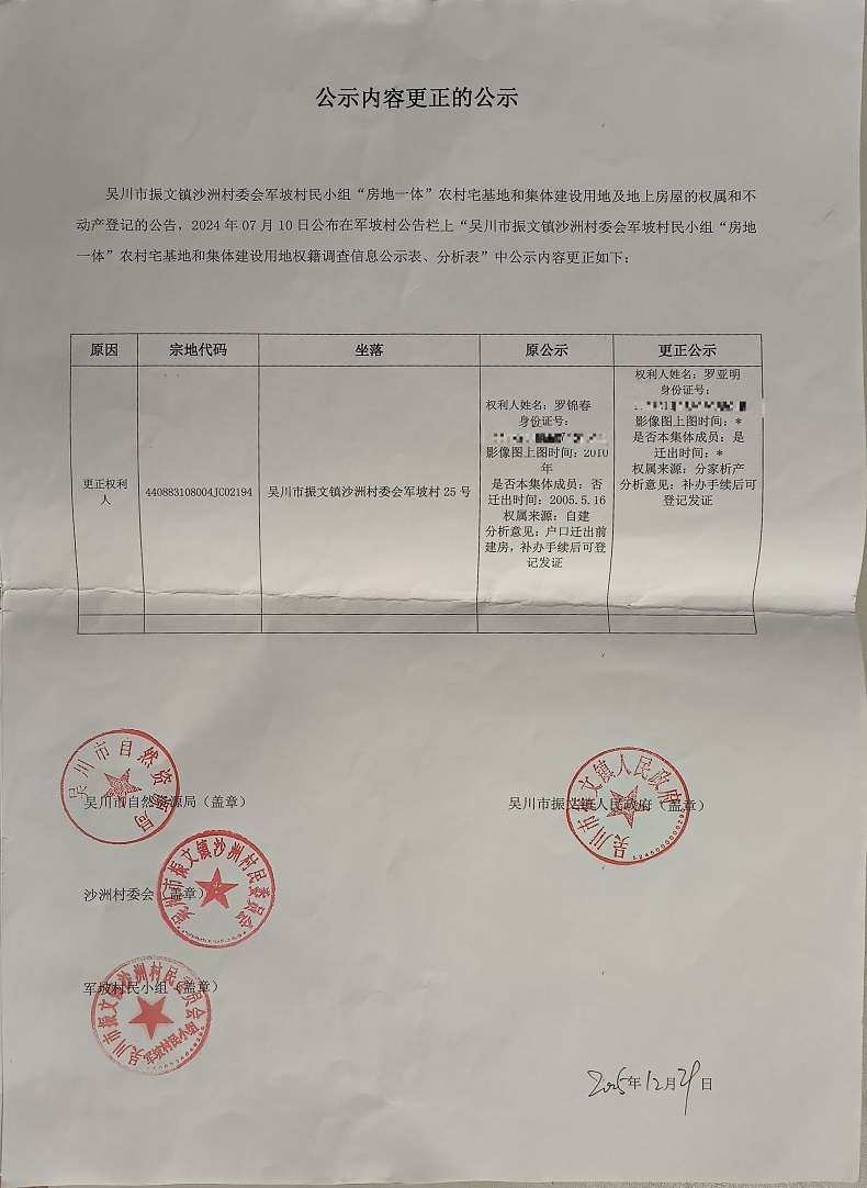 吴川市振文镇沙洲村委会军坡村民小组公示内容更正的公告