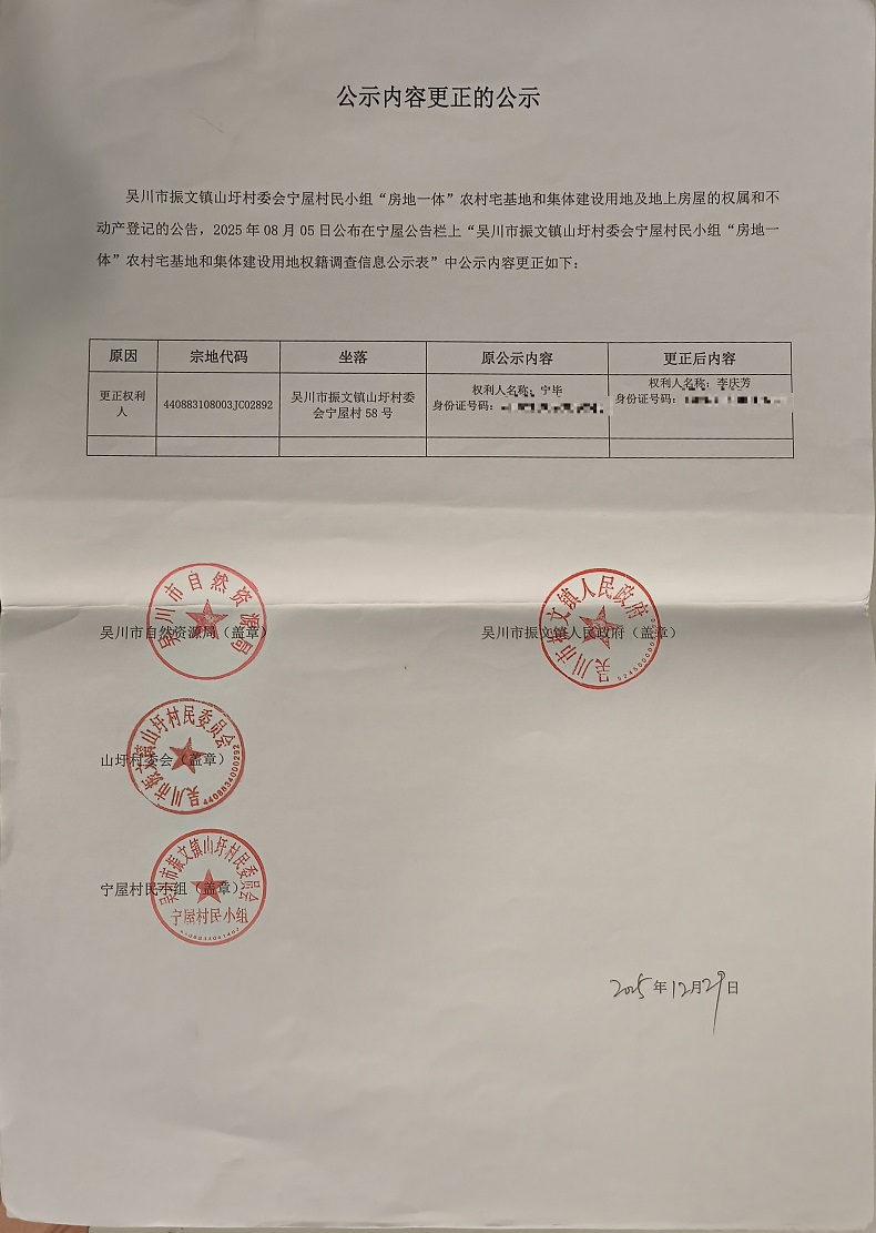 吴川市振文镇山圩村委会宁屋村民小组公示内容更正的公告