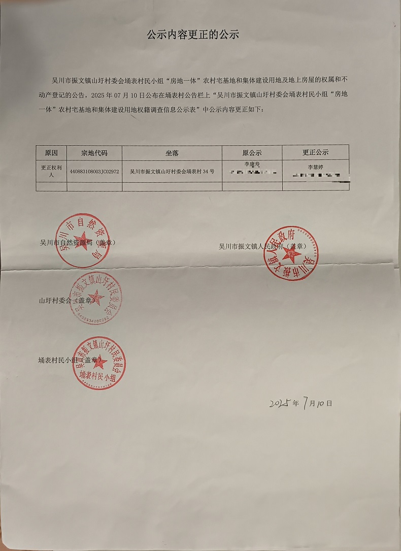 吴川市振文镇山圩村委会埇表村民小组公示内容更正的公告
