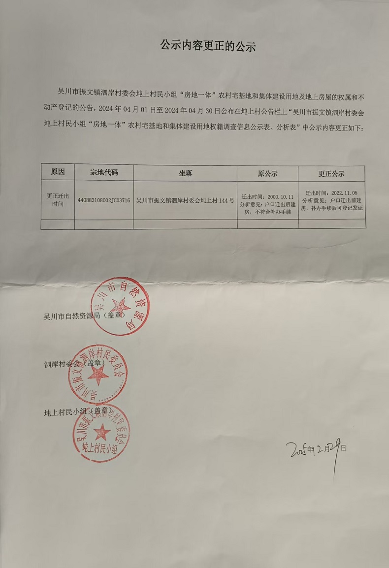 吴川市振文镇泗岸村委会坉上村民小组公示内容更正的公告