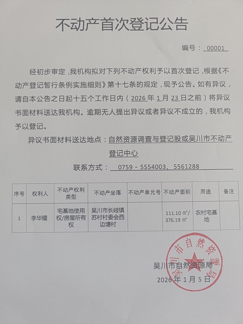 不动产首次登记公告(李华耀)宗地面积:111.10平方米、建筑面积:376.19平方米