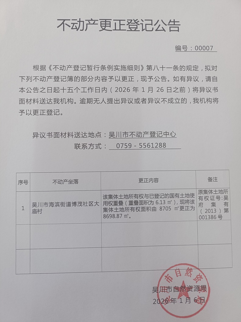 不动产更正登记公告(广东省吴川市海滨街道博茂社区大庙经济合作社)宗地面积:8698.87平方米