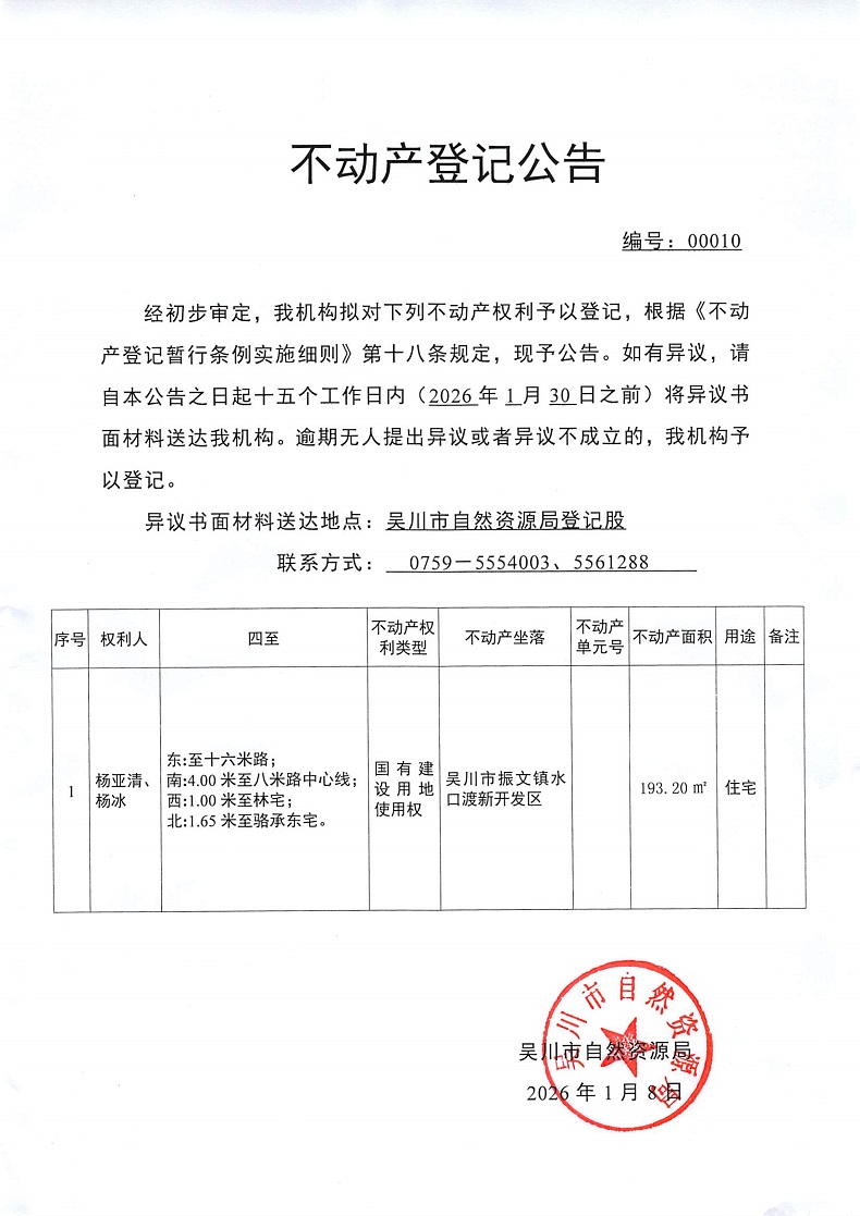 不动产登记公告(杨亚清、杨冰)