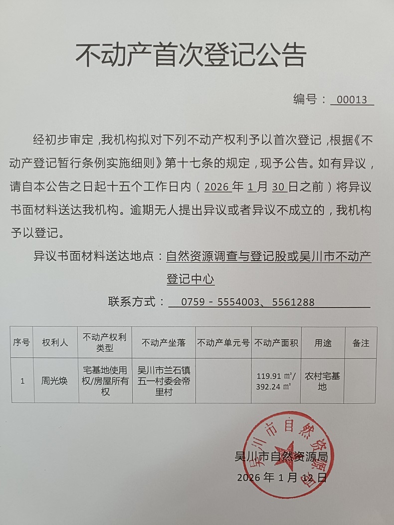 不动产首次登记公告(周光焕)宗地面积:119.91平方米、建筑面积:392.24平方米