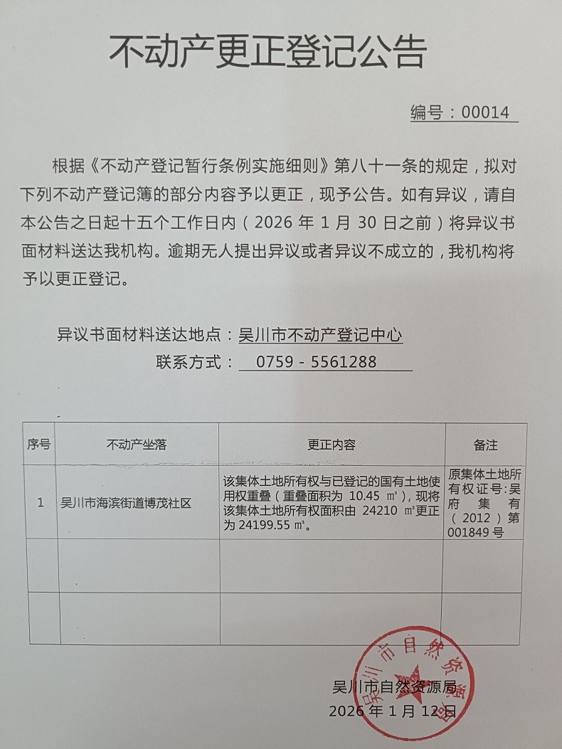不动产更正登记公告(广东省吴川市海滨街道博茂社区大庙、梅逢社区梅逢、李屋经济合作社)宗地面积:24199.55平方米