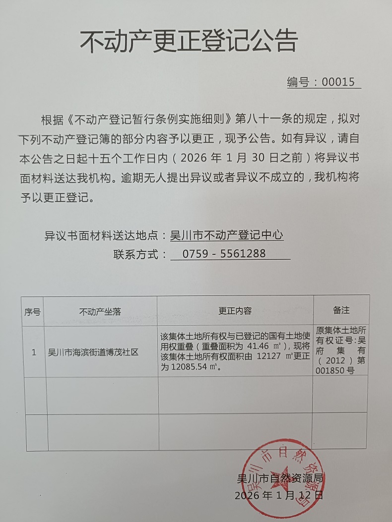 不动产更正登记公告(广东省吴川市海滨街道鸿城社区崧高岭、博茂社区路口、李屋经济合作社)宗地面积:12085.54平方米