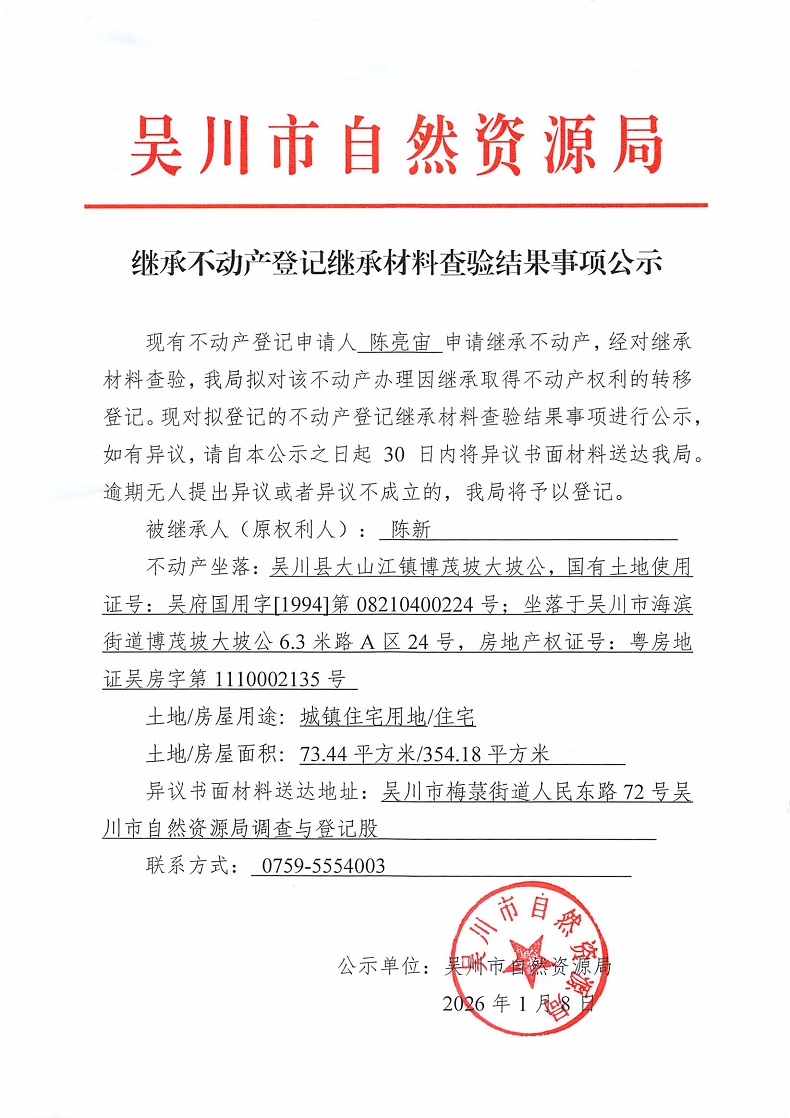 继承不动产登记继承材料查验结果事项公示(陈新)