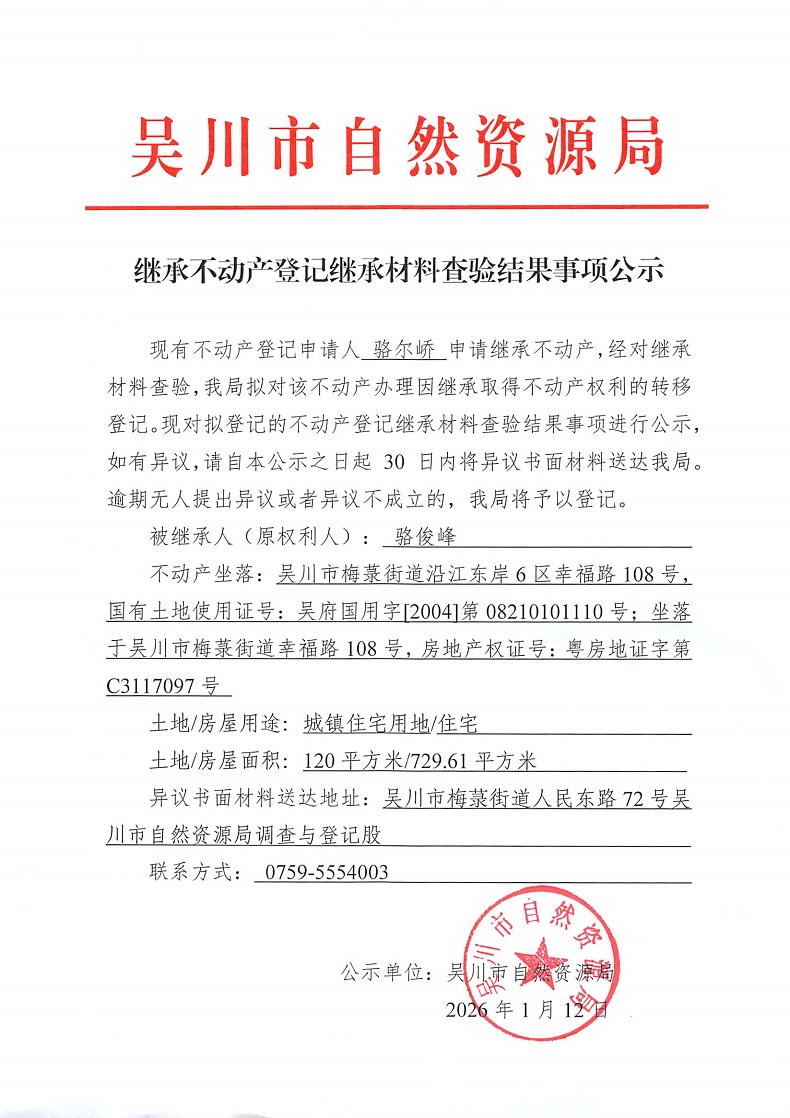 继承不动产登记继承材料查验结果事项公示(骆俊峰)
